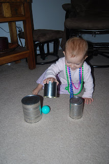 This idea came from here.  I took three different sized cans and a small ball.  I hid the ball under one of the cans and asked Ella to find it.  No problem.  Then, I put the ball under the same can, but changed the cans position.  Again, no problem to find the ball.  We repeated this step again and again she found the ball on the first try.  So I put it under a different can and tried the game again.  This game never tricked Ella.  I was surprised that no matter how much mixing I did, she still picked the right can on the first try everytime!  She did have a lot of fun with this game though.