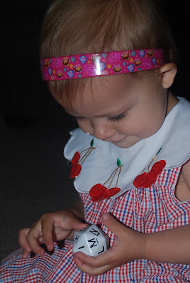 Ella, loves to be a part of our games too, so whenever it was her turn, we would help her with the sound of the letter that she rolled. Prior to this game, she had already memorized the sounds of the letters t, p, m, and f. I don't think that she memorized any new letters by playing the game because she was only interested in rolling the die and it was VERY hard for her to wait her turn! Notice the tear on her cheek? That's because she was trying to take the die, even when it wasn't her turn.